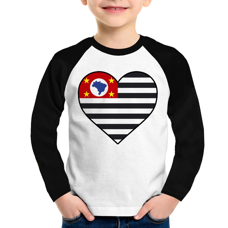 A Camiseta Raglan Infantil São Paulo Bandeira Estado Coração Manga Longa é confeccionada em tecido 100% Poliéster com gola redonda na cor preta, costura simples e modelagem com caimento reto. A estampa do tema "Bandeiras" é feita através do processo Sublimação. Produto ideal para quem busca fidelidade da estampa e ótimo custo-benefício, a estampa não desbota nem quebra.
