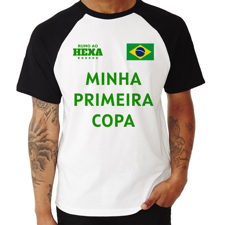 A Camiseta Raglan Minha Primeira Copa do Mundo é confeccionada em tecido 100% Poliéster com gola redonda na cor preta, costura simples e modelagem com caimento reto. A estampa do tema "Esportes" é feita através do processo Sublimação. Produto ideal para quem busca fidelidade da estampa e ótimo custo-benefício, a estampa não desbota nem quebra.