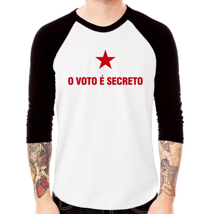 A Camiseta Raglan O voto é secreto Manga 3/4 é confeccionada em tecido 100% Poliéster com gola redonda na cor preta, costura simples e modelagem com caimento reto. A estampa do tema "Política" é feita através do processo Sublimação. Produto ideal para quem busca fidelidade da estampa e ótimo custo-benefício, a estampa não desbota nem quebra.