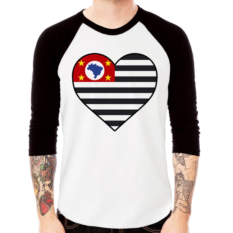 A Camiseta Raglan São Paulo Bandeira Estado Coração Manga 3/4 é confeccionada em tecido 100% Poliéster com gola redonda na cor preta, costura simples e modelagem com caimento reto. A estampa do tema "Bandeiras" é feita através do processo Sublimação. Produto ideal para quem busca fidelidade da estampa e ótimo custo-benefício, a estampa não desbota nem quebra.