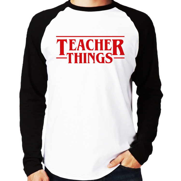 A Camiseta Raglan Teacher Things Manga Longa é confeccionada em tecido 100% Poliéster com gola redonda na cor preta, costura simples e modelagem com caimento reto. A estampa do tema "Cursos e Profissões" é feita através do processo Sublimação. Produto ideal para quem busca fidelidade da estampa e ótimo custo-benefício, a estampa não desbota nem quebra.