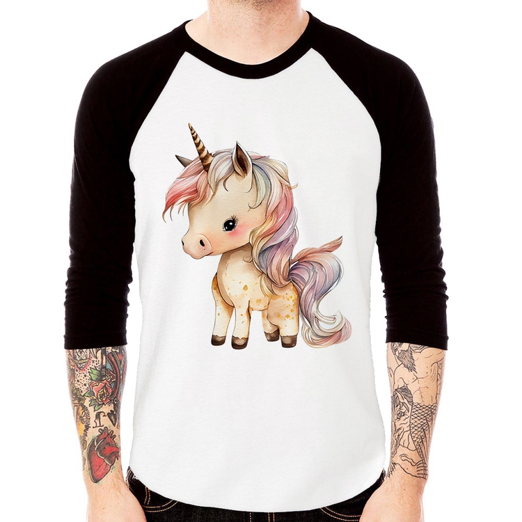 A Camiseta Raglan Unicórnio Desenho Manga 3/4 é confeccionada em tecido 100% Poliéster com gola redonda na cor preta, costura simples e modelagem com caimento reto. A estampa do tema "Animais" é feita através do processo Sublimação. Produto ideal para quem busca fidelidade da estampa e ótimo custo-benefício, a estampa não desbota nem quebra.