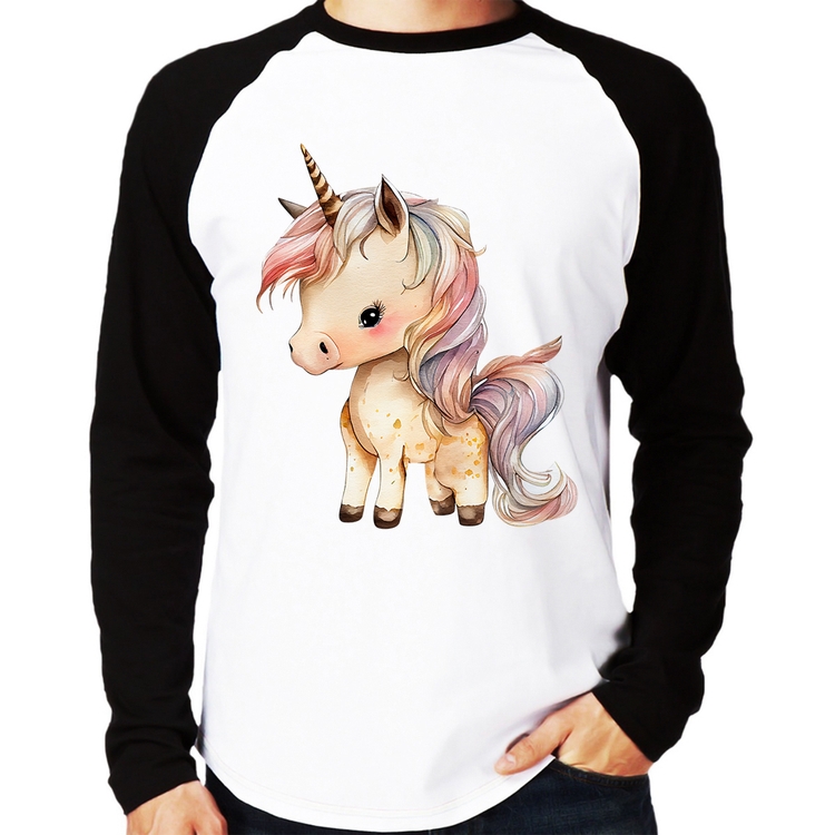 A Camiseta Raglan Unicórnio Desenho Manga Longa é confeccionada em tecido 100% Poliéster com gola redonda na cor preta, costura simples e modelagem com caimento reto. A estampa do tema "Animais" é feita através do processo Sublimação. Produto ideal para quem busca fidelidade da estampa e ótimo custo-benefício, a estampa não desbota nem quebra.