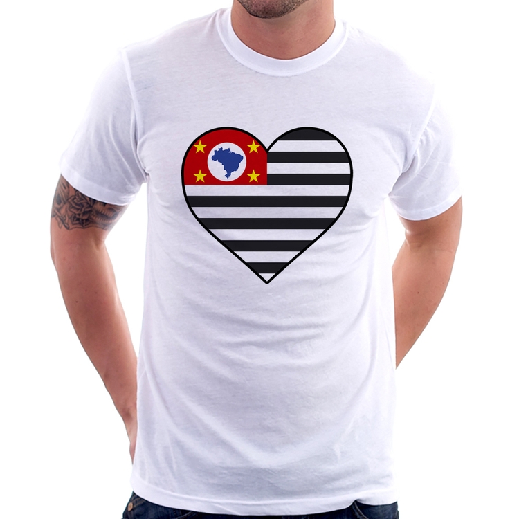 A Camiseta São Paulo Bandeira Estado Coração é confeccionada em tecido 100% Poliéster com gola redonda, costura simples e modelagem com caimento reto. A estampa do tema "Bandeiras" é feita através do processo Sublimação. Produto ideal para quem busca fidelidade da estampa e ótimo custo-benefício, a estampa não desbota nem quebra.