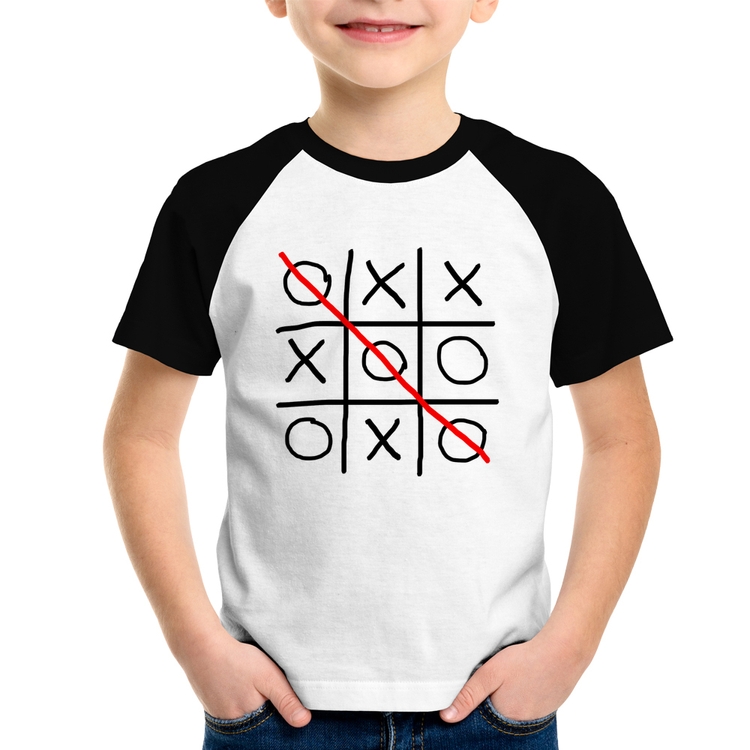 A Camiseta Raglan Infantil Jogo da Velha é confeccionada em tecido 100% Poliéster com gola redonda na cor preta, costura simples e modelagem com caimento reto. A estampa do tema "Game e Jogos" é feita através do processo Sublimação. Produto ideal para quem busca fidelidade da estampa e ótimo custo-benefício, a estampa não desbota nem quebra.