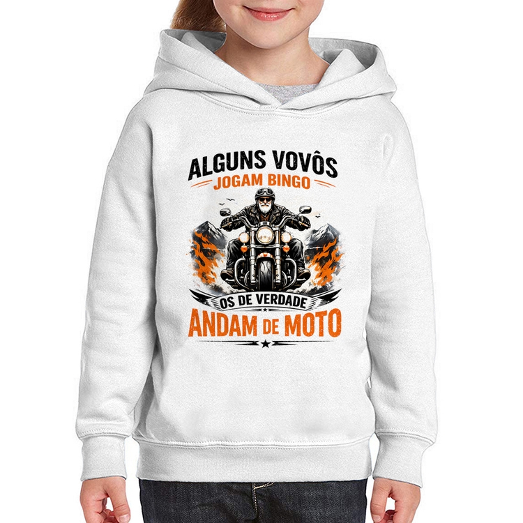 O Moletom Infantil Alguns vovôs jogam bingo, os de verdade andam de moto é confeccionado em tecido 88% Poliéster e 12% Algodão com gola redonda, capuz e bolso lateral, costura reforçada e modelagem com caimento reto. A estampa do tema "Motos e Bikes" é feita através do processo Sublimação. Produto ideal para quem busca fidelidade da estampa e ótimo custo-benefício, a estampa não desbota nem quebra.
