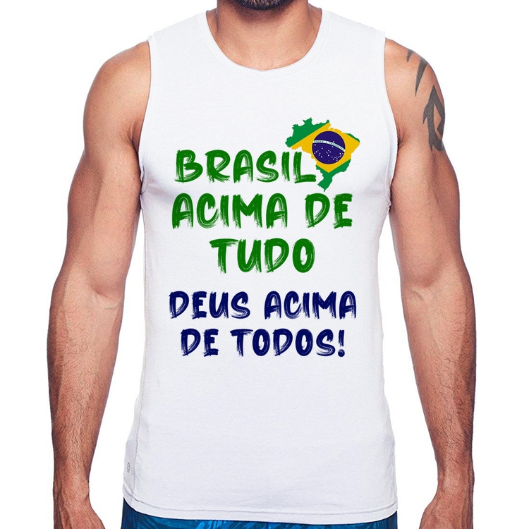 A Regata Brasil Acima de Tudo Deus Acima de Todos - Bandeira é confeccionada em tecido 100% Poliéster com gola redonda viés, costura simples e modelagem com caimento reto. A estampa do tema "Política" é feita através do processo Sublimação. Produto ideal para quem busca fidelidade da estampa e ótimo custo-benefício, a estampa não desbota nem quebra.