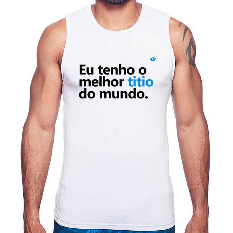 A Regata Eu tenho o melhor titio do mundo é confeccionada em tecido 100% Poliéster com gola redonda viés, costura simples e modelagem com caimento reto. A estampa do tema "Comemorativas" é feita através do processo Sublimação. Produto ideal para quem busca fidelidade da estampa e ótimo custo-benefício, a estampa não desbota nem quebra.