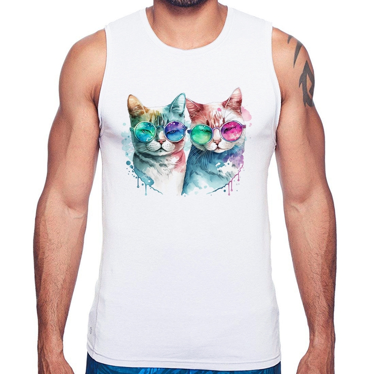 A Regata Gatos de óculos é confeccionada em tecido 100% Poliéster com gola redonda viés, costura simples e modelagem com caimento reto. A estampa do tema "Esportes" é feita através do processo Sublimação. Produto ideal para quem busca fidelidade da estampa e ótimo custo-benefício, a estampa não desbota nem quebra.