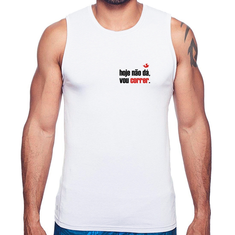 A Regata Hoje não dá, vou correr é confeccionada em tecido 100% Poliéster com gola redonda viés, costura simples e modelagem com caimento reto. A estampa do tema "Esportes" é feita através do processo Sublimação. Produto ideal para quem busca fidelidade da estampa e ótimo custo-benefício, a estampa não desbota nem quebra.