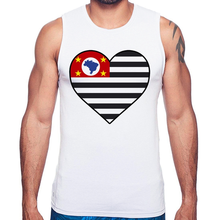 A Regata São Paulo Bandeira Estado Coração é confeccionada em tecido 100% Poliéster com gola redonda viés, costura simples e modelagem com caimento reto. A estampa do tema "Bandeiras" é feita através do processo Sublimação. Produto ideal para quem busca fidelidade da estampa e ótimo custo-benefício, a estampa não desbota nem quebra.
