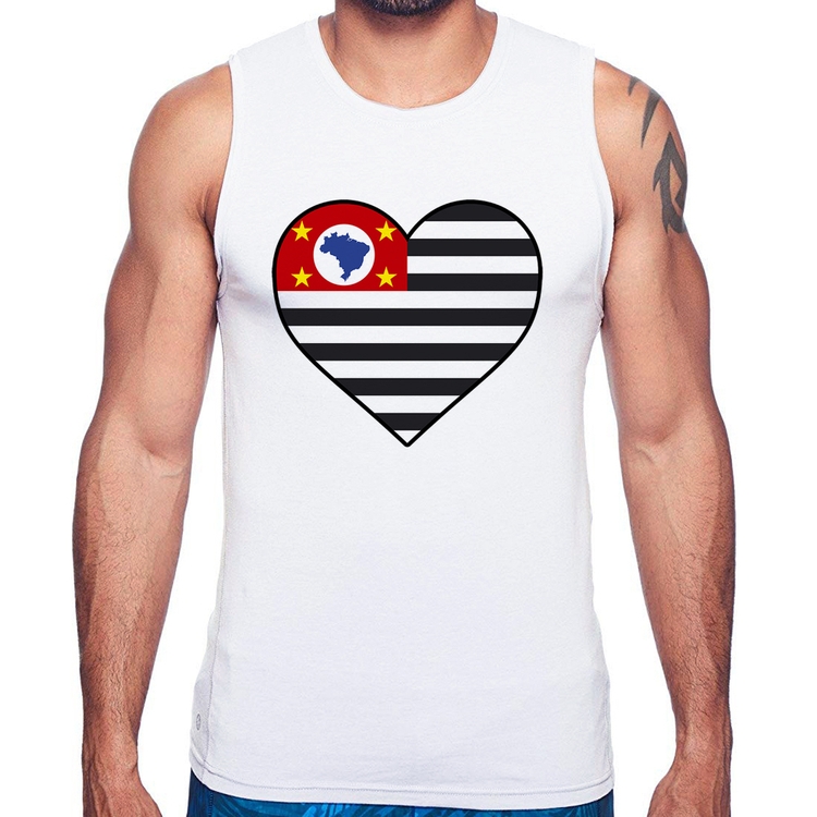 A Regata São Paulo Bandeira Estado Coração é confeccionada em tecido 100% Poliéster com gola redonda viés, costura simples e modelagem com caimento reto. A estampa do tema "Bandeiras" é feita através do processo Sublimação. Produto ideal para quem busca fidelidade da estampa e ótimo custo-benefício, a estampa não desbota nem quebra.